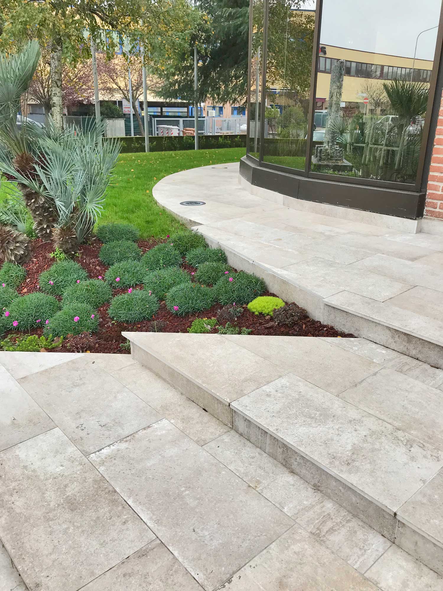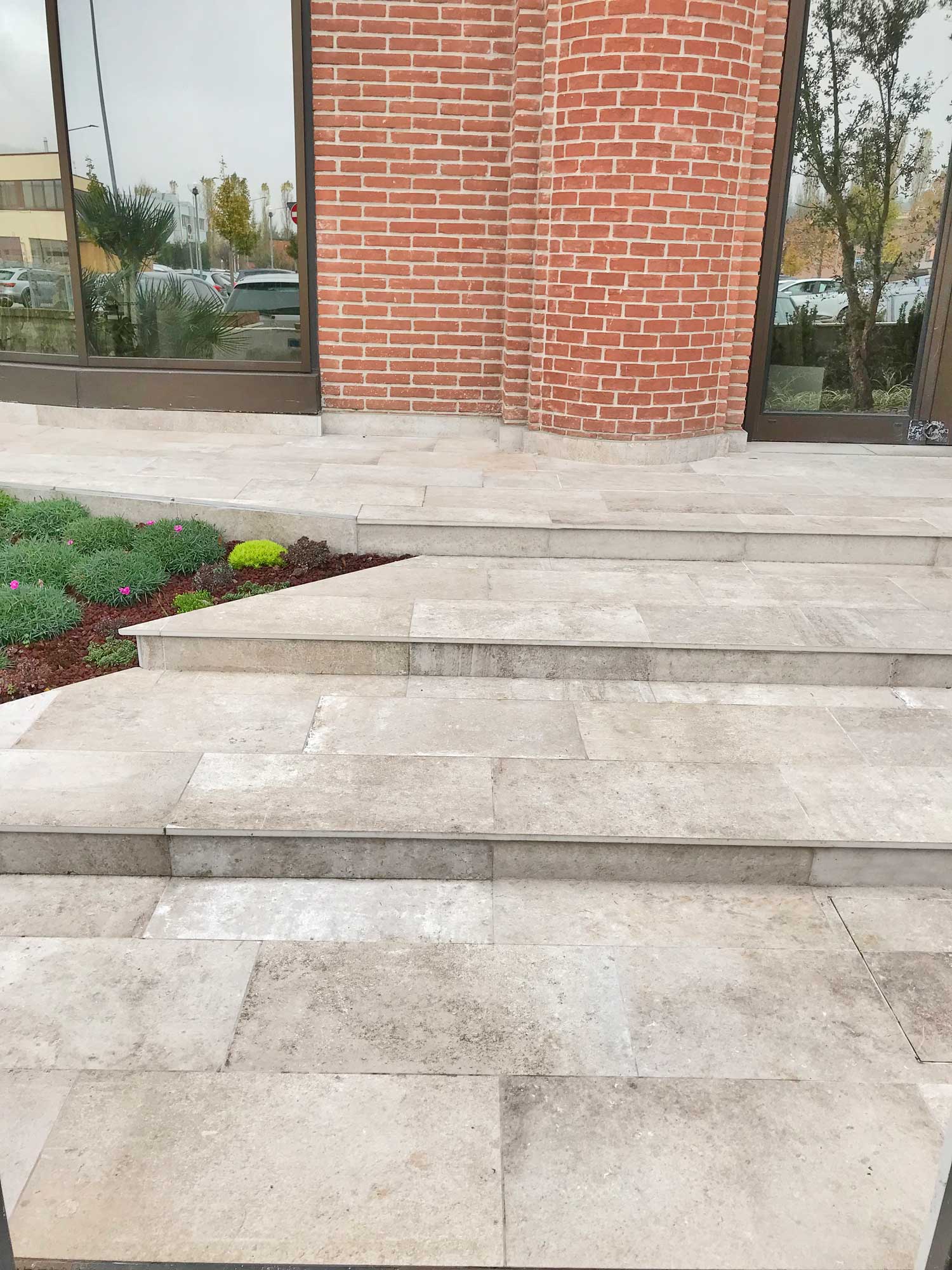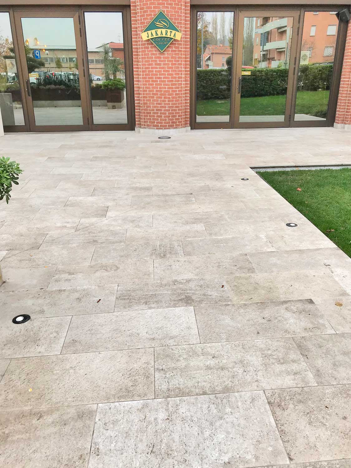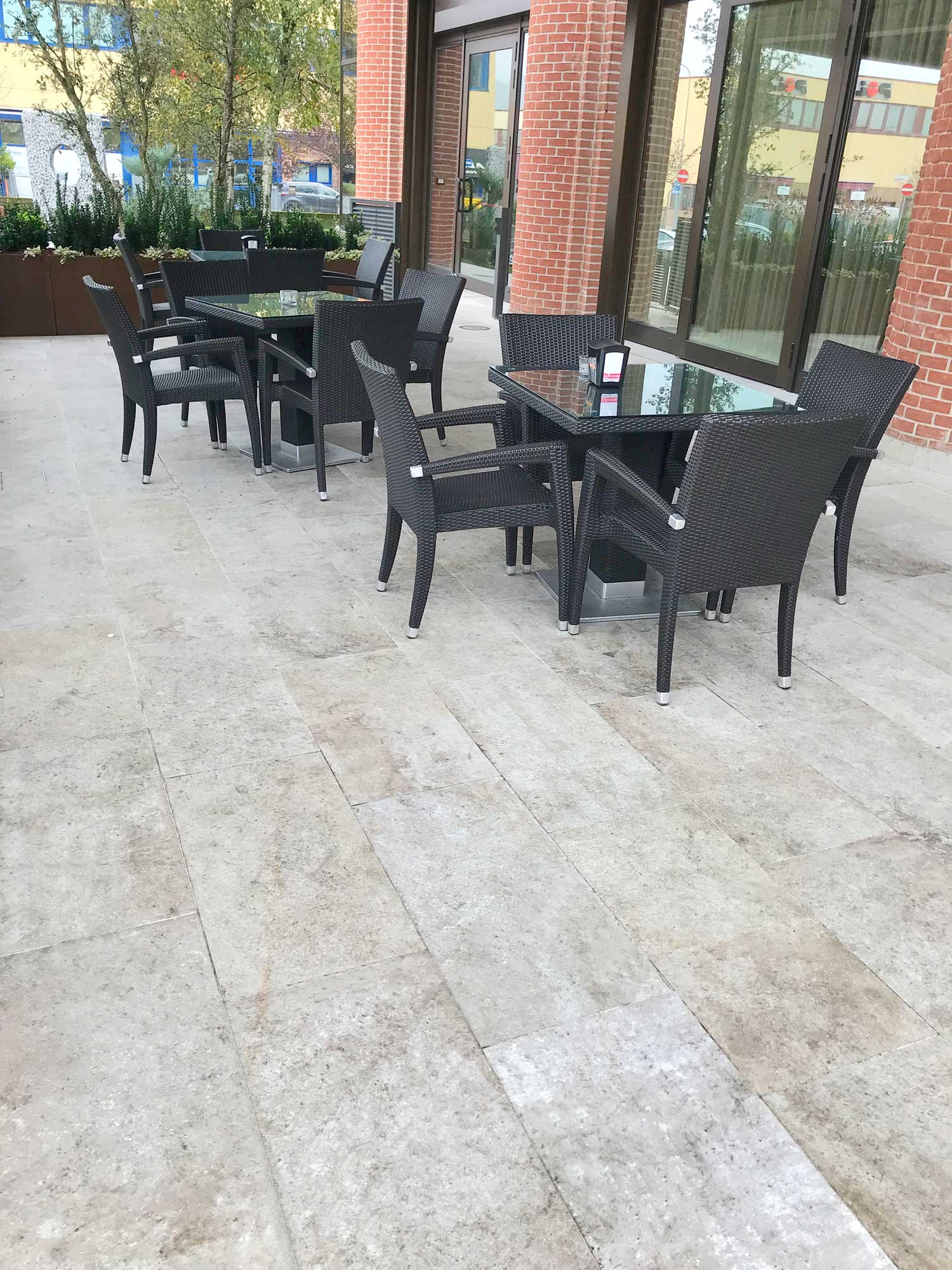 Im Außenbereich der Cafeteria La Spaziale in Bologna wurde den 2 cm dicken gesinterten Feinsteinzeug boden L’ALTRA PIETRA verlegt.